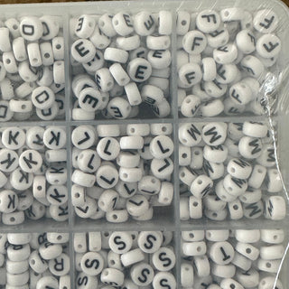 7mm White Acrylic Letter Beads - Silver Letters - Metal Enlaced - Flat Round